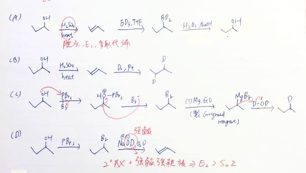 (C)PBr3可把OH替換成好的離去基Br,再和Mg製造有機金屬攻擊D2O最後接上D