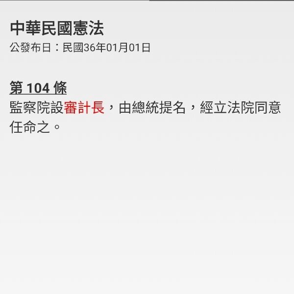 憲法第104條 監察院設審計長,由總統提名,經立法院同意任命之。 |