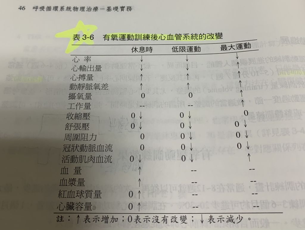 靜脈氧差下降 ③低限運動時收縮壓下降 ④低限運動時絕對攝氧量不變