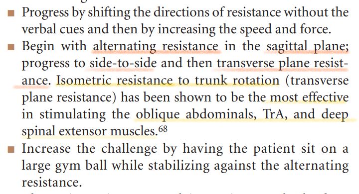 胸腰椎的 PNF 穩定訓練(交替等長 Alternating Isometrics;節律性穩定 Rhythmic Stabilization)通常由最易控制的平面開始到最不穩定的平面: