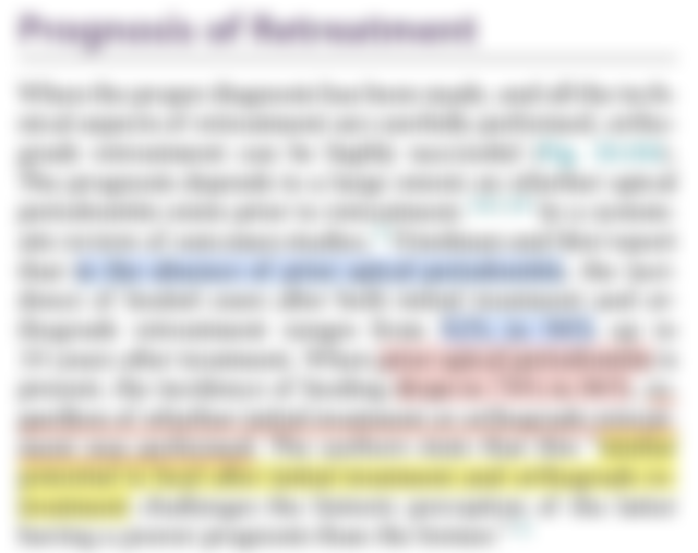 (D)治療前有根尖周圍炎,接受根管重新治療的牙齒,十年追蹤的治癒率降為七成以下