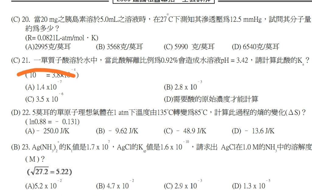 21. 一單質子酸溶於水中,當此酸解離比例為0.92%會造成水溶液pH = 3.42,請計算此酸的Ka ?( 10–3.42= 3.8×10–4)
