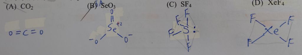 SF4屬於AB4E,有一個孤對電子,其分子構形是蹺蹺板形。