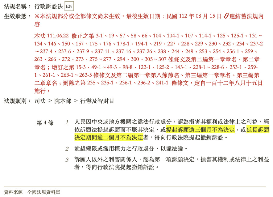 人民因中央或地方機關之違法行政處分,認為損害其權利或法律上之利益,經依訴願法提起訴願而不服其決定,或提起訴願逾三個月不為決定,或延長訴願決定期間逾二個月不為決定者,得向行政法院提起撤銷訴訟。