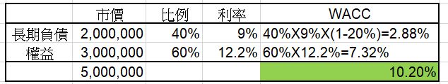 經濟附加價值(EVA) = 稅後淨利 - 加權平均資本成本 X (總資產-流動負債)