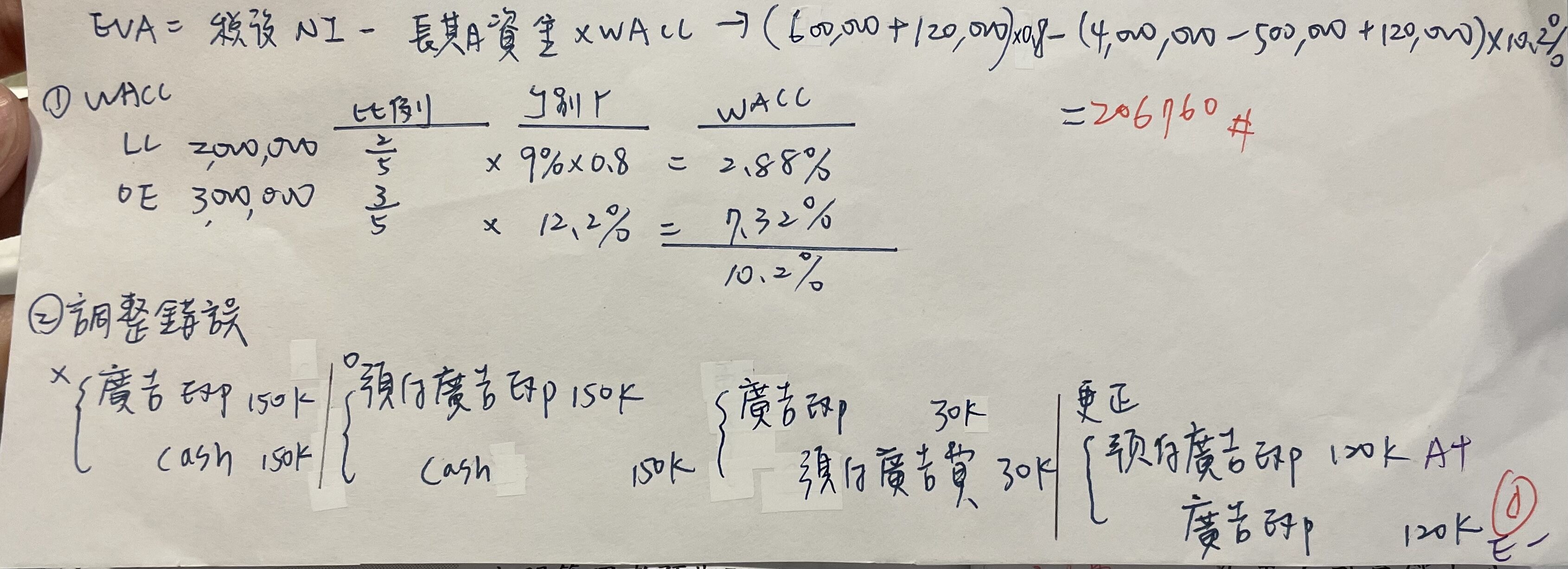 經濟附加價值(EVA)=576,000 - 10.2% X ( 4,120,000-500,000) = 206,760