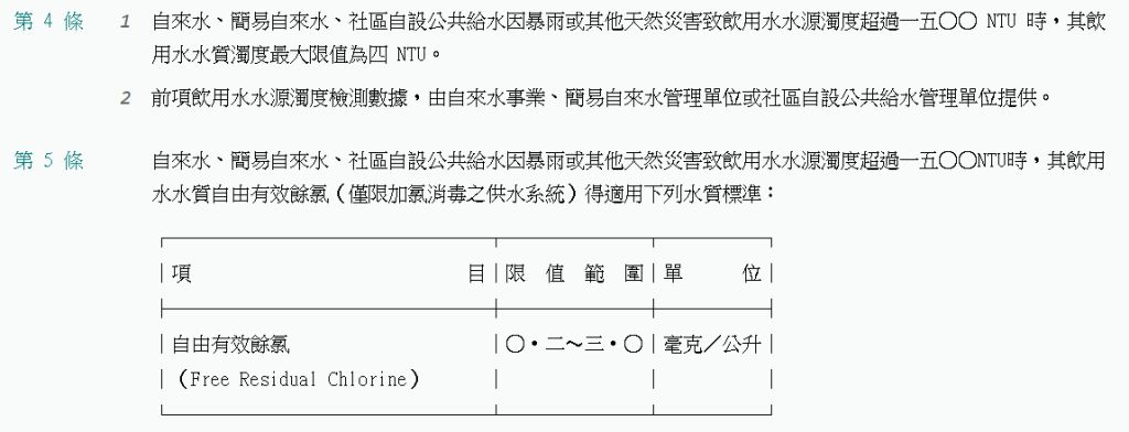 過多少NTU時,其飲用水水質自由有效餘氯得適用0.2~2.0毫克/公升?