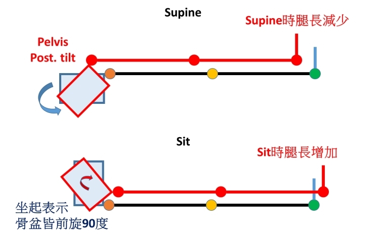 時右腳顯得較長 ⑤起身坐起成長坐姿勢(long sitting)時右腳顯得較短 ⑥起身坐起成長坐姿勢時右腳顯得