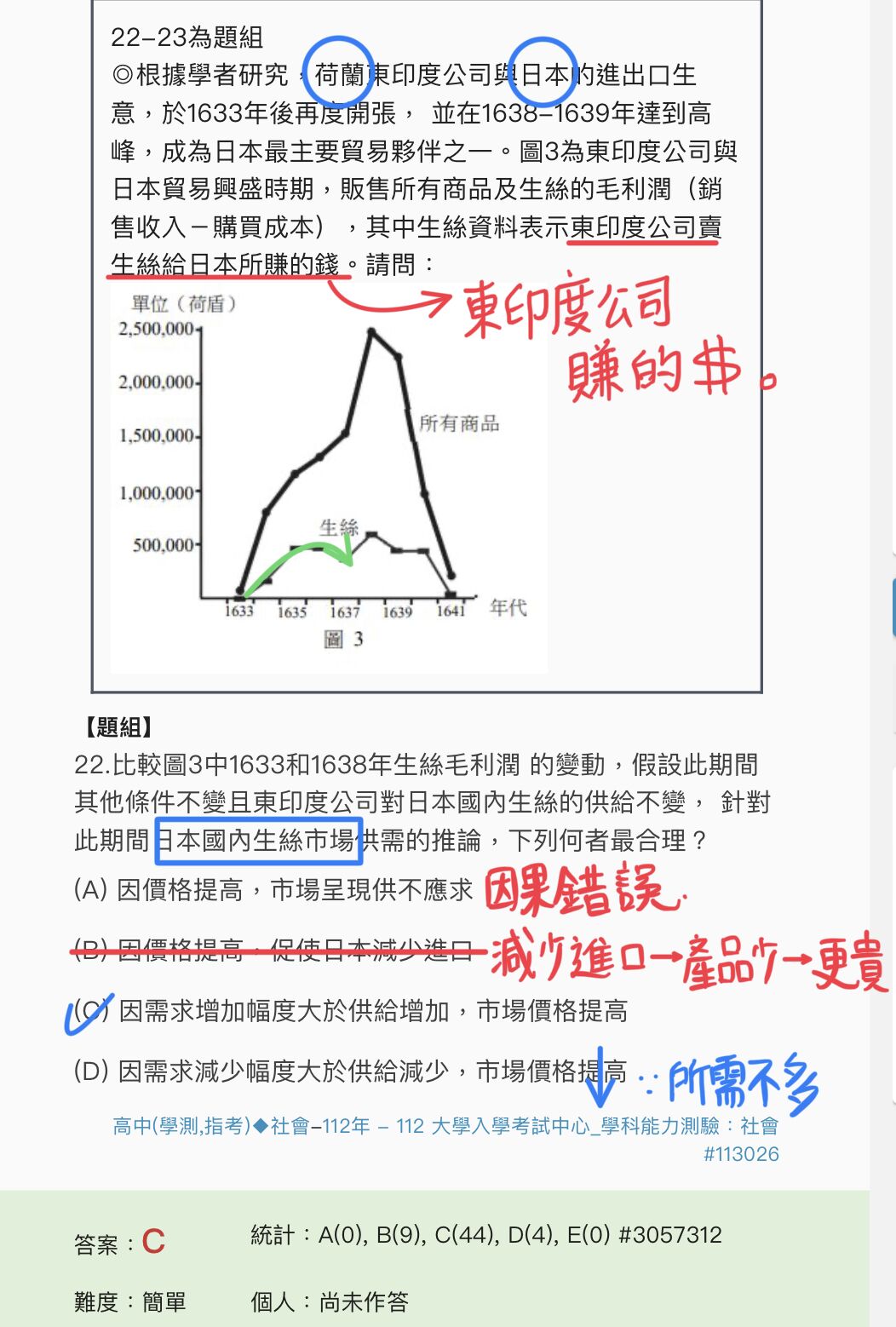 22.比較圖3中1633和1638年生絲毛利潤 的變動,假設此期間其他條件不變且東印度公司對日本國內生絲的供給不變, 針對此期間日本國內生絲市場供需的推論,下列何者最合理?
