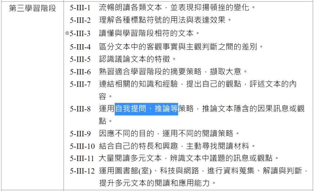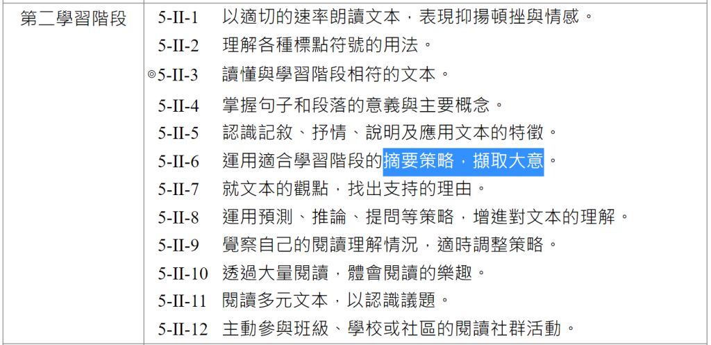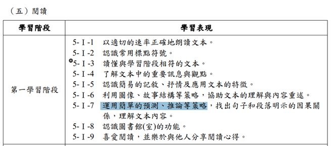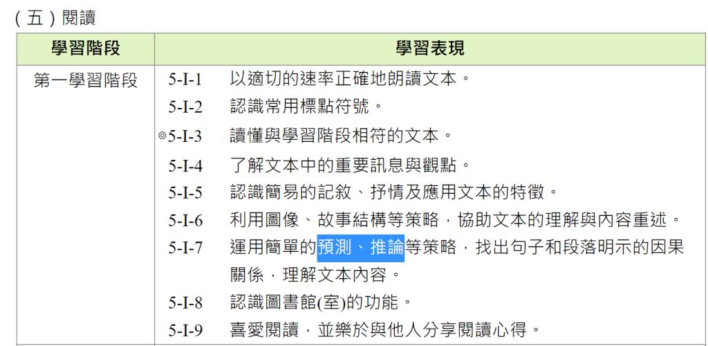 教育課程綱要國民中小學暨普通型高級中等學校語文領域-國語文》的閱讀學習表現,配合小學階段第一學習階段的