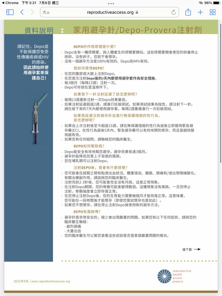 (D) Depo-Provera®注射後不會立即有避孕效果,建議先用保險套避孕
