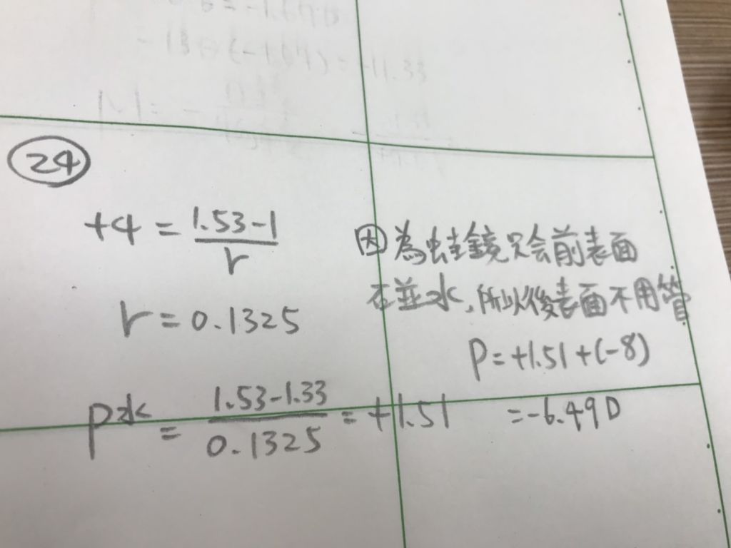24 使用球面計(lens clock)量測一蛙鏡(n=1.53)之表面屈光力,前表面為+4.00 DS,後表面為-8.00 DS。