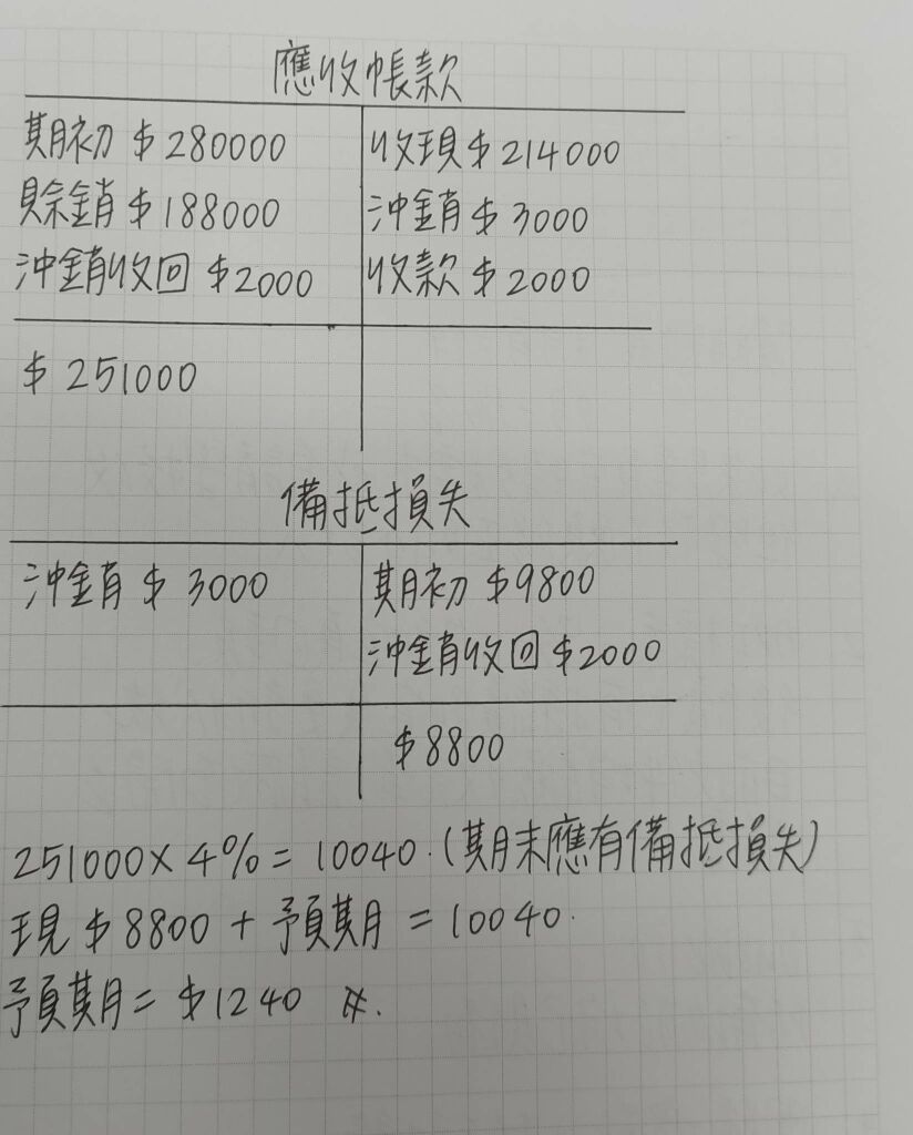 24.甲公司 X10 年初應收帳款餘額為$280,000,備抵損失有貸餘$9,800,當年度公司賒銷為$188,000,帳款收現$214,000。