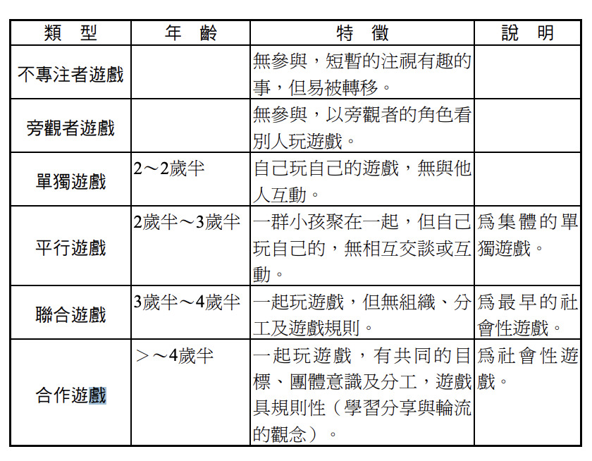 (6)合作遊戲(cooperative play):約在四歲半之後,與其他的兒童玩,比次之間有分工及相互協助,以達成故同目標(吳幸玲,2003;潘慧玲1992;Goncu, & Klein,2001)。