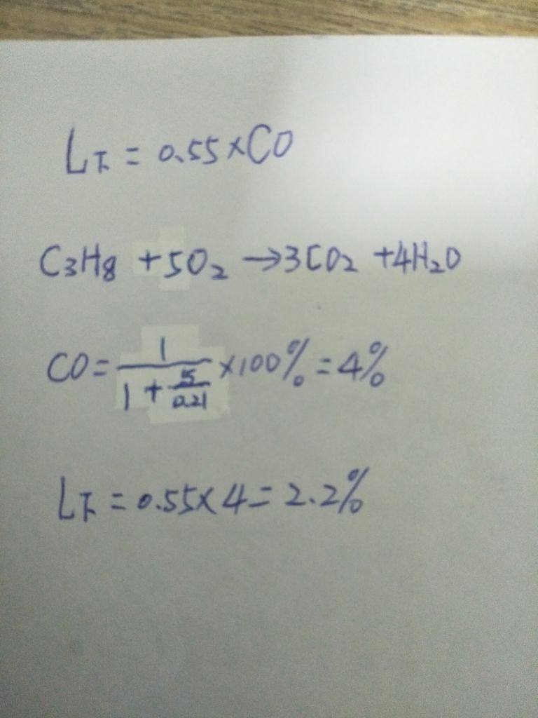 25 請依據可燃性氣體完全燃燒時的化學理論濃度,計算丙烷的燃燒下限?