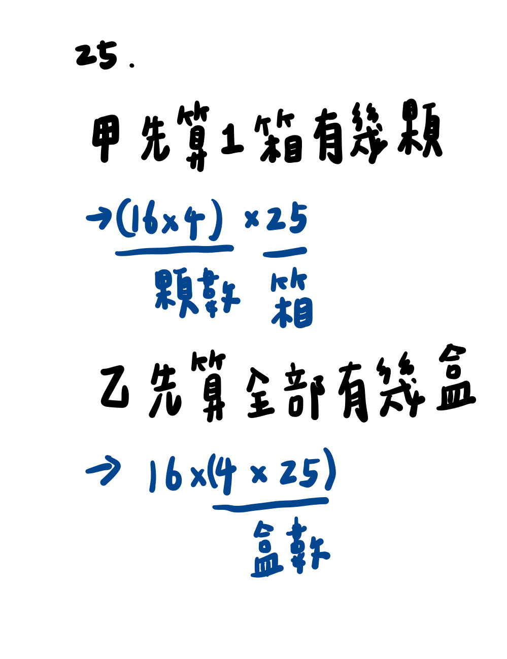 25.有關「乘法結合律」的教學,教師布一數學問題:「水果行進貨一批釋迦,老闆先把每16 顆裝一盒,每 4 盒裝成一箱,全部裝完,總共裝了 25 箱。問老闆進貨多少顆釋迦?請用一個算式列式,並算出答案。」