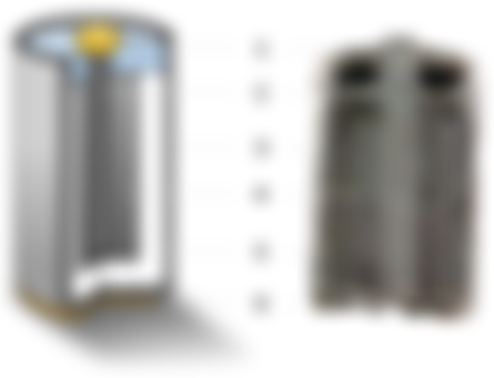 碳鋅電池的橫截面。1:金屬帽(+),2:...