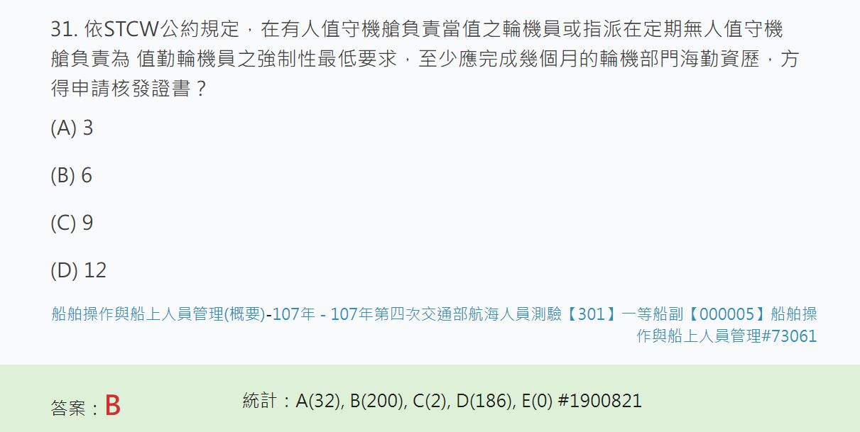 25. 依STCW公約及2010年修正案規定,在有人值守機艙負責當值之輪機員或指派在定期無人值守機艙負責為值勤輪機員之強制性最低要求,至少應完成幾個月的輪機部門海勤資歷,方得申請核發證書?