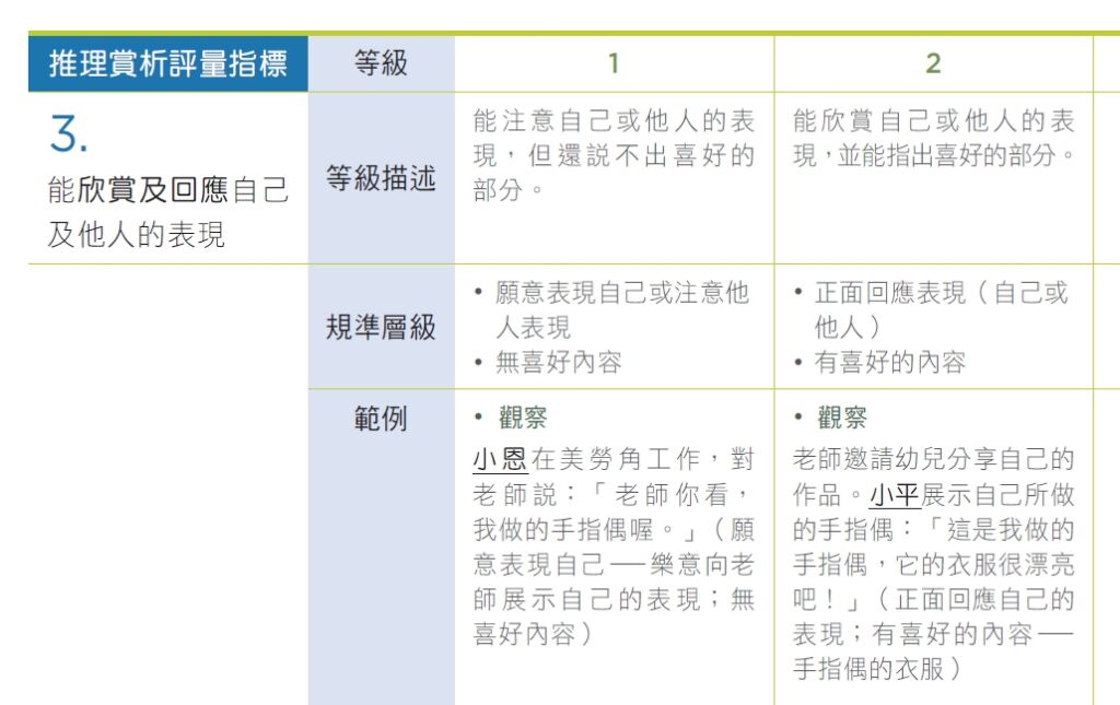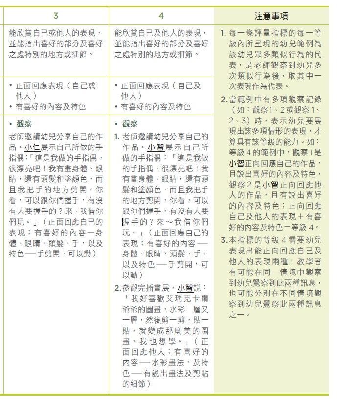 - 正面回應表現:指對自己或他人的表現表達出肯定的看法,可以是說出、畫出或用肢體表現出來;回應的方式沒有「合宜性」的問題。通常有說出喜好內容或特色的時候,幼兒就已經對欣賞對象作出正向回應了。