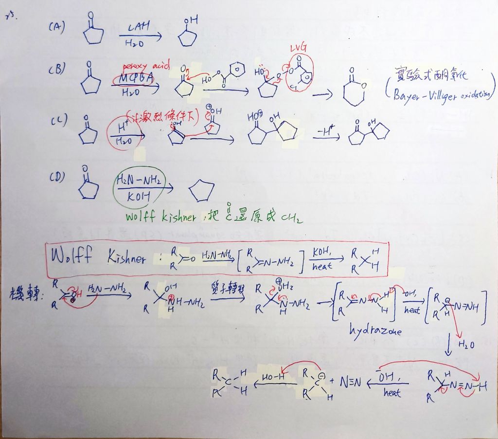 25. 請問下列那個反應條件可以讓 cyclopentanone 經由反應後產生 cyclopentane 產物?