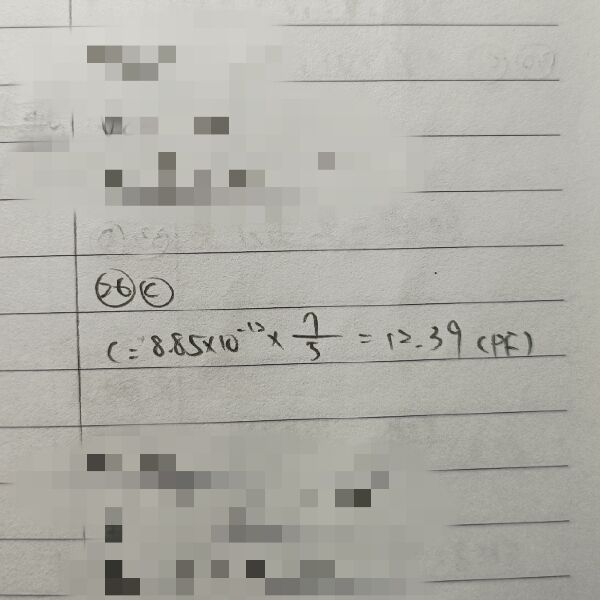 26 使用六片金屬電極板所構成的多層式平行板結構,側面圖如圖所示,假設各極板重疊的面積均為 10 cm2,以空氣為介電質,各極板間距離為 5 mm,計算其等效電容值為 8.85 pF。如果將金屬電極板由六片增加為八片,其他結構與參數均不變,計算其等效電容值為何?