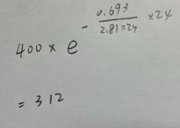 26.已知111In之物理半衰期為2.81天,生物半衰期為4小時。病患原先安排星期一上午8:00接受111In-WBC檢 查,製藥室於上午8:00配置400 µCi的111In-WBC,結果病患遲到24小時後注射配置好的藥物,注射當時之活 度為多少µCi?