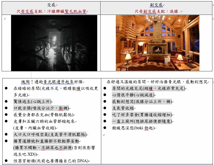 發生會讓人緊張的事情就是交感神經支配 EX:很暗的時候、考試的時候(會消化不良,可以推測交感神經活化胃液不分泌、腸道不蠕動)、射精的時候