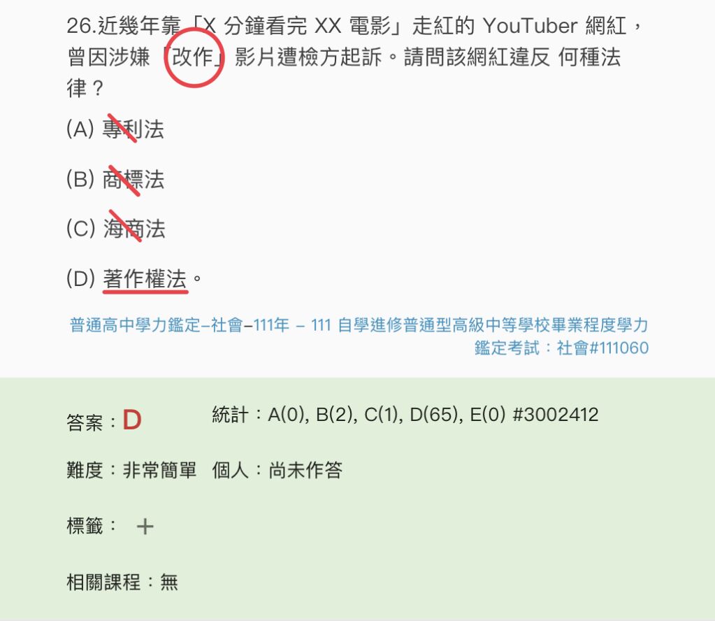 26.近幾年靠「X 分鐘看完 XX 電影」走紅的 YouTuber 網紅,曾因涉嫌「改作」影片遭檢方起訴。請問該網紅違反 何種法律?