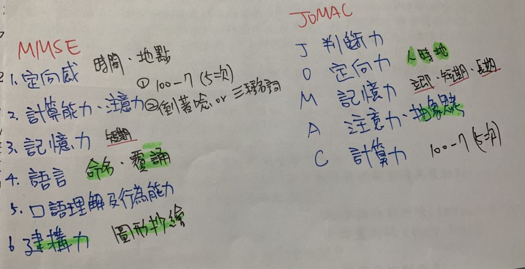 J(Judgment)判斷能力 →EX:當回到家,打開家門卻聞到瓦斯味,該怎麼辦? O(Orientation)方向 →人、時間、地點 M(Memory)記憶 →立即記憶/工作記憶/訊息登陸: 汽車、蘋果、椅子(請病人覆誦 →短期:為期數小時~數天(EX:早餐吃什麼) →長期:一輩子都不會忘的(EX:家裡住址/電話….) A(Abstraction)抽象思考 →俚語/諺語 EX:吃果子拜樹頭/螳螂捕蟬,黃雀在後 C(Calculation)計算能力 →100-7再-7再-7………..(算5次即可) | Normal/impair ※每個項目個別計分 | ||||