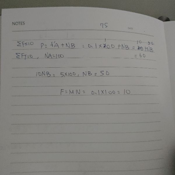 26. 如圖 ( 八 ) 所示,有一梯子重 100 N,靠在光滑的牆壁,梯腳與地面的靜摩擦係數為 0.1, 欲移動梯子向右滑動,求 P 力的最小值為多少 N?