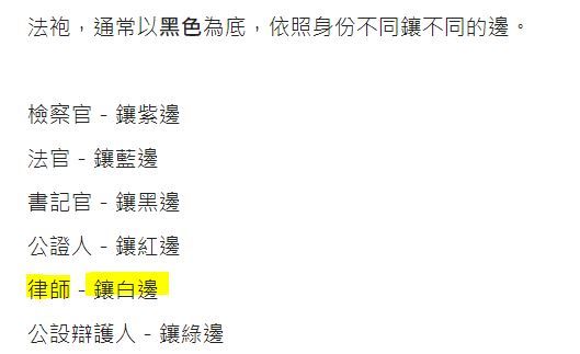 27 法官、檢察官、公設辯護人、律師及書記官在法庭執行職務時,應著制服,關於各制服鑲邊之顏色之下列敘述,何者錯誤?