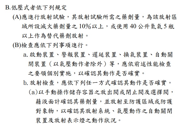 (A)應進行放射試驗,其放射試驗所需之藥劑量,為該放射區域所設滅火藥劑量之10%以上,或使用四十公升氮氣五瓶以上作為替代藥劑放射。