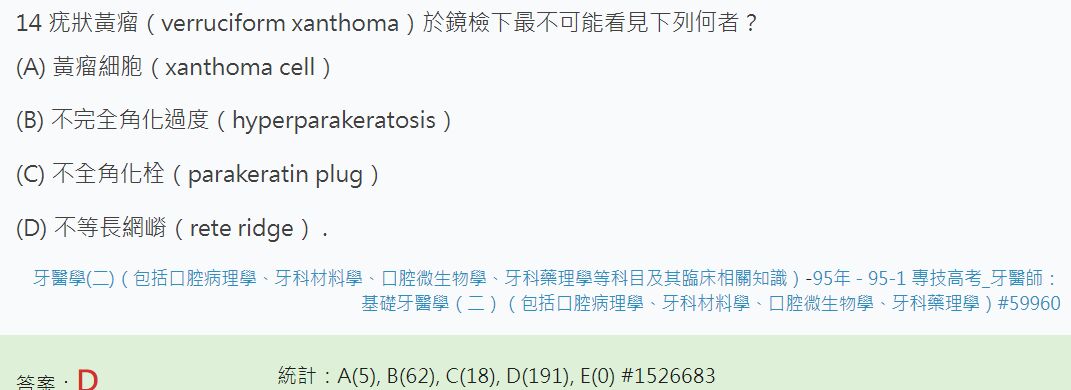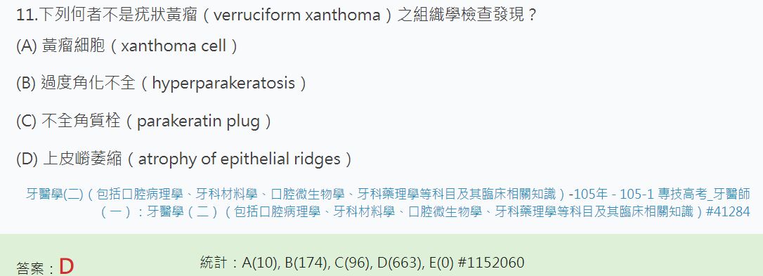 (C)疣狀黃瘤上皮表面呈疣狀,且常覆蓋不完全角質(parakeratin)