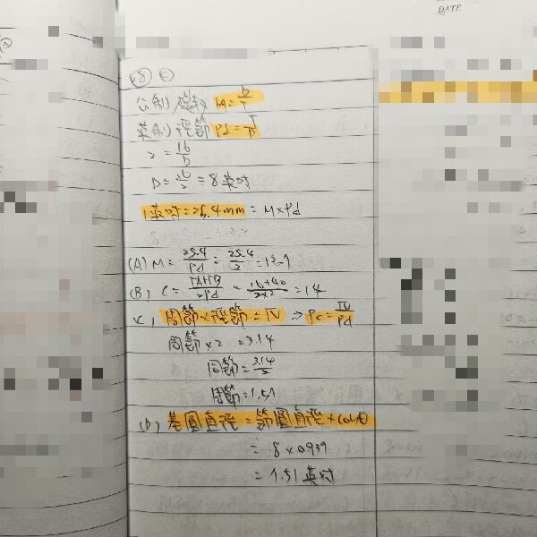 28 某正齒輪組由 16 齒的小齒輪與 40 齒的大齒輪組成。其徑節=2,壓力角 20 度。下列敘述何者正確?