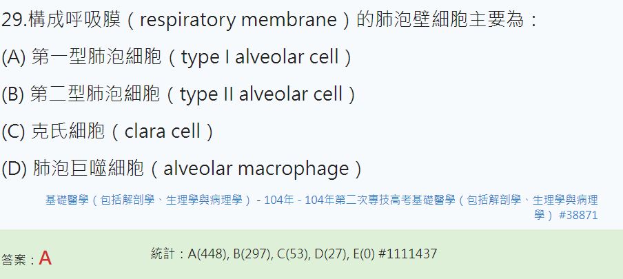 (D)呼吸膜由肺泡上皮組織、肺泡基底膜層、肺泡與微血管之間的組織間隙、微血管基膜層和微血管內皮細胞
