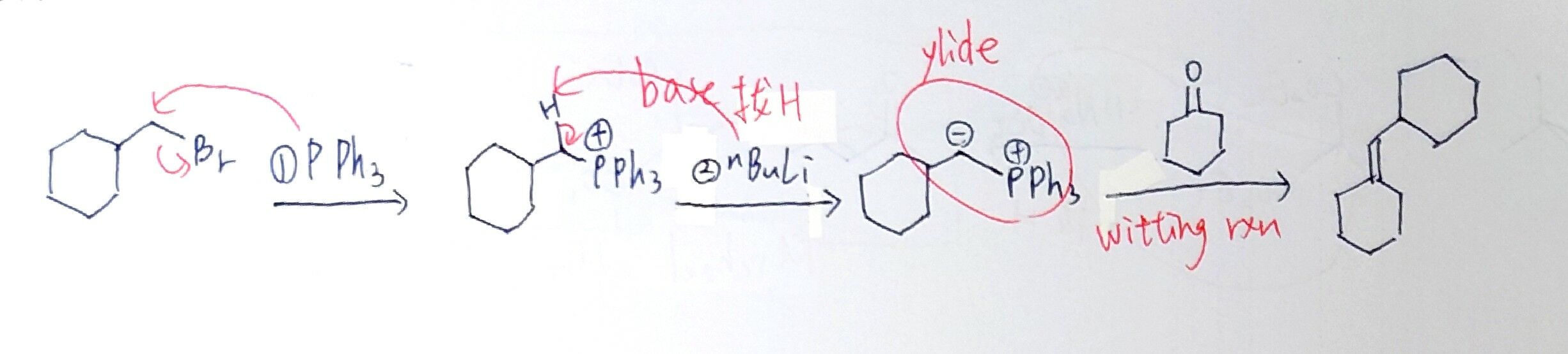 2.強鹼(NaH或n-BuLi或NaNH2)會與PPh3旁的H產生酸鹼反應,產生ylide