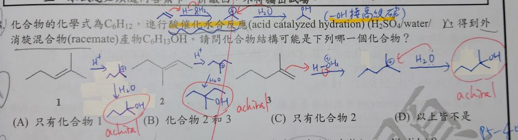 消旋混合物(racemate)產物C6H13OH。請問化合物結構可能是下列哪一個化合物?