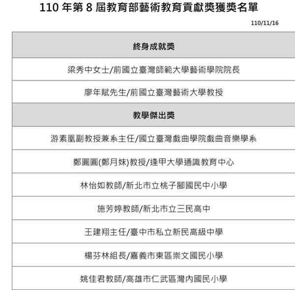 在個人「教學傑出」獎項,獲獎的高雄市仁武區灣內國小姚佳君老師創新課程設計,結合音樂與 其他領域發展各項課程,成立跨校藝術社群,將研發課程帶入偏鄉小校,並協助弱勢兒童藝術學習、推動八八風災小林村「大武壠族歌謠」族群音樂文化傳承,實為難得;國立臺灣戲曲學院戲曲音樂學系游素凰副教授從事傳統藝術教育工作三十餘載,出版多種專業著作,結合傳統與創新積極規劃、推展傳統戲曲課程,栽培戲曲音樂人才,從事教學、研究及戲曲藝術推廣均著力甚深。