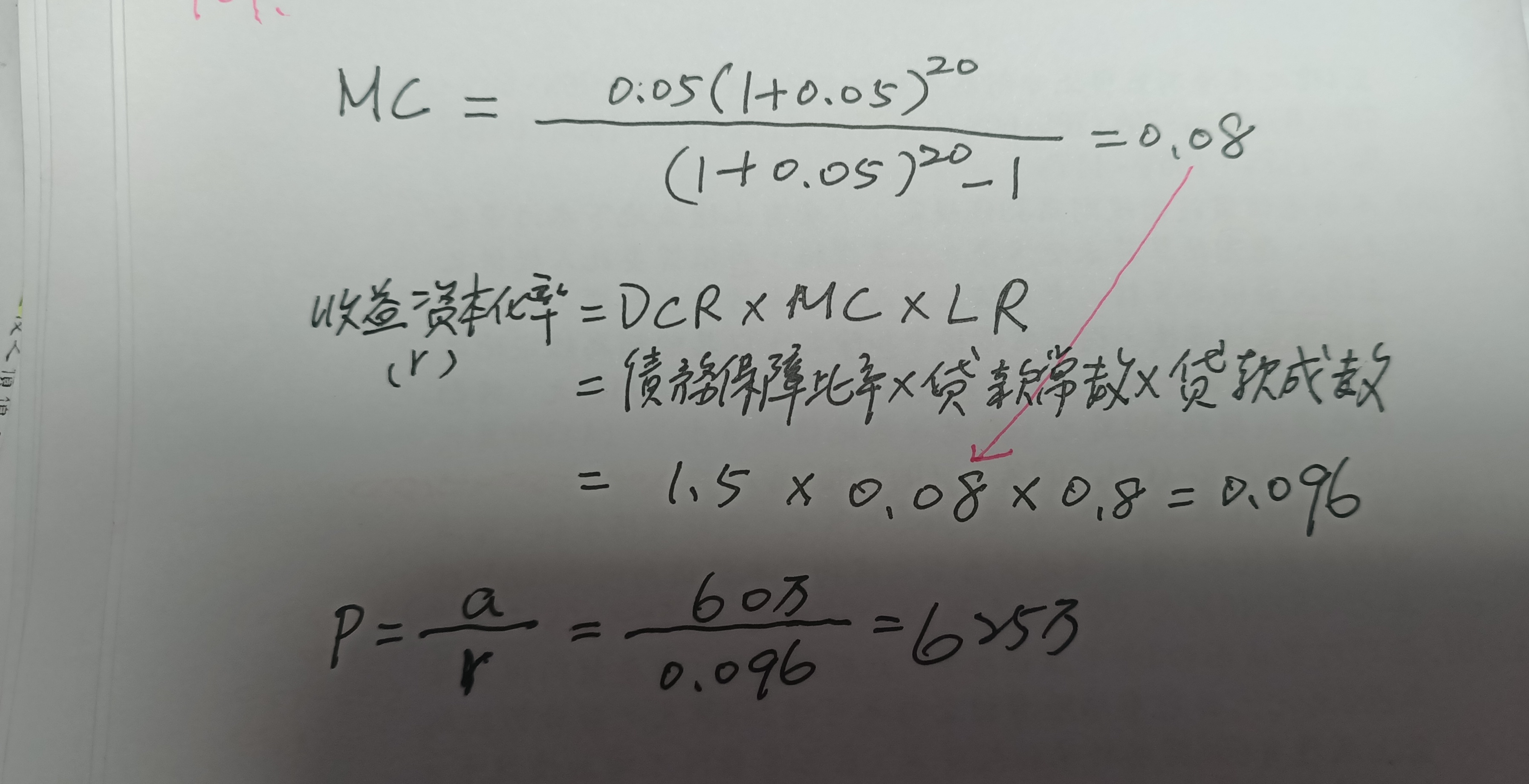 貸款常數(MC) = { [ 年利率 * (1+年利率) ^年數 ] } / { [ (1+年利率) ^年數] - 1 } 註:^表示次方 MC= { [ 0.05 * (1+0.05) ^20 ] } / { [ (1+0.05) ^20] - 1 } =0.08 收益資本化率=1.5 X 0.08 X 0.8=0.096 P=a(營業淨收益 60 萬元)/r(0.096)=625(約等於)