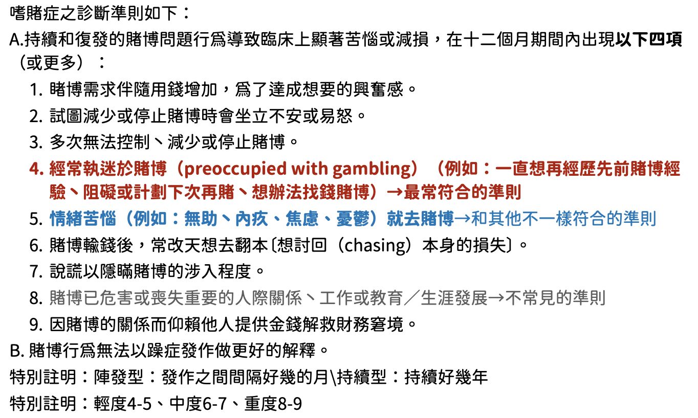 29 有關 DSM-5 的嗜賭症(gambling disorder)之診斷敘述,下列何者正確?