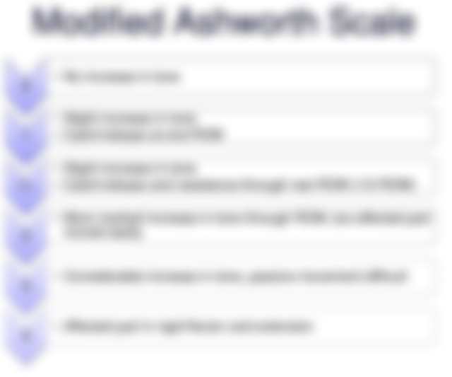 | 1 | 被動活動患側肢體道終末端時有輕微阻力。 Slight increase in muscle tone, manifested by a catch and release or by minimal resistance at the end of the ROM when the affected part(s) is moved in flexion or extension. |