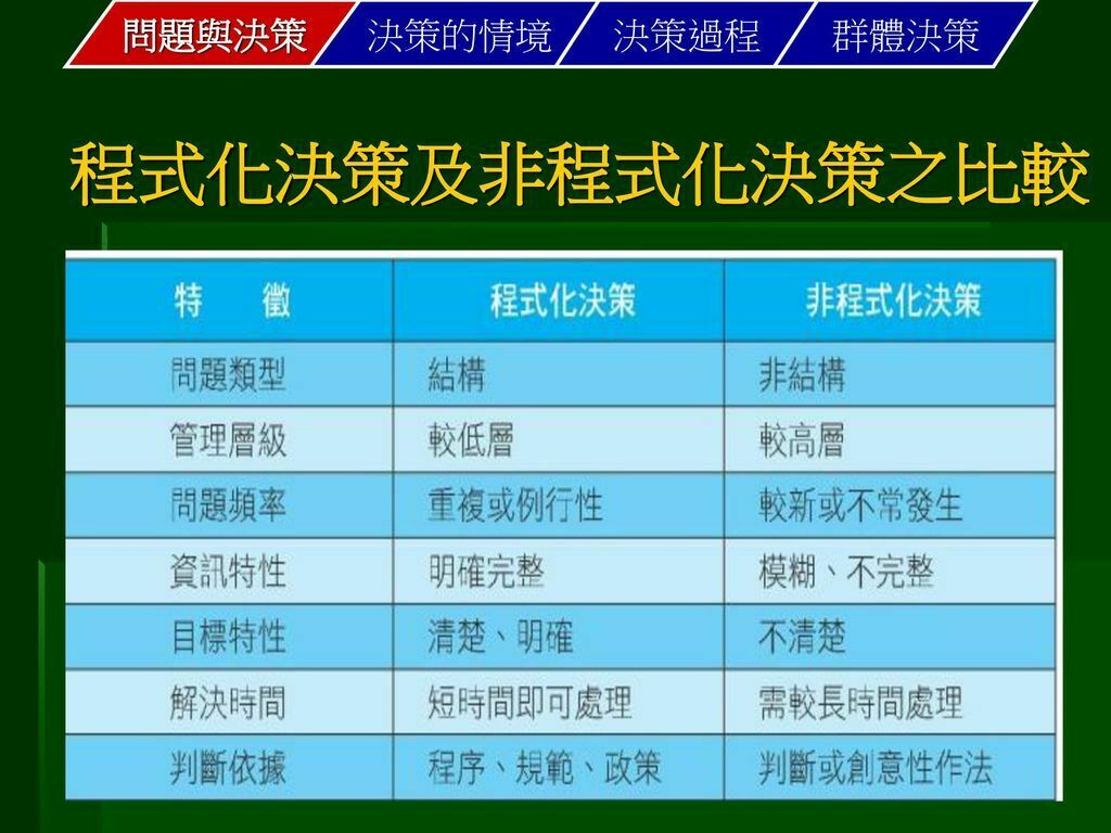 程式化決策(Programmed Decision)又稱為例行性的決策。主要是指決策是重複性與例行性的,並且能夠透過機械化的程序來加以解決。一般而言,程式化決策是處理高結構化問題的有效方法。