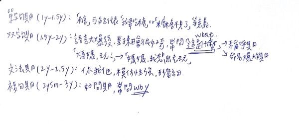 語言發展順序:1.這是什麼?(命名爆炸期、電報式語言:1.5y~2y)