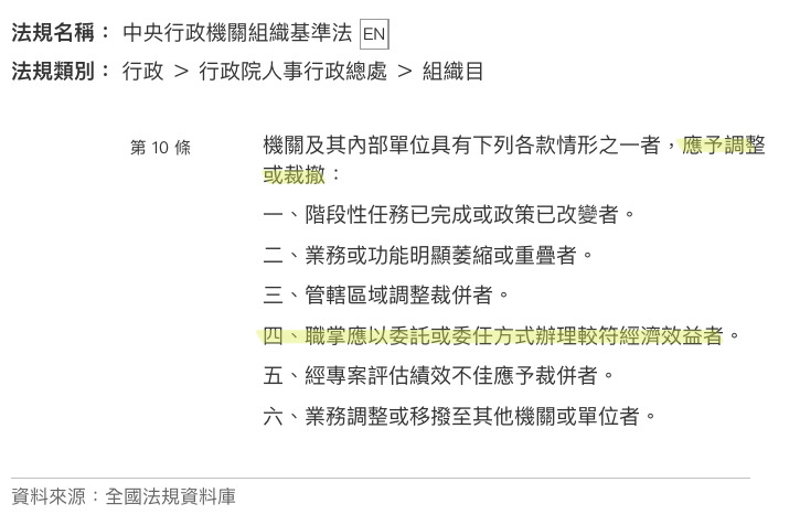 (C)職掌應以委託或委任方式辦理較符經濟效益者,應予調整或裁撤