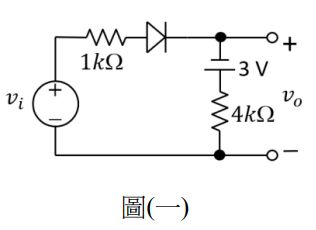 3. 如圖(一)所示之二極體電路,假設Vi (?) = 10cos377t, V,二極體順向導通電壓為 0.7 V,則流經 1 kΩ電阻之電流最大值為何?
