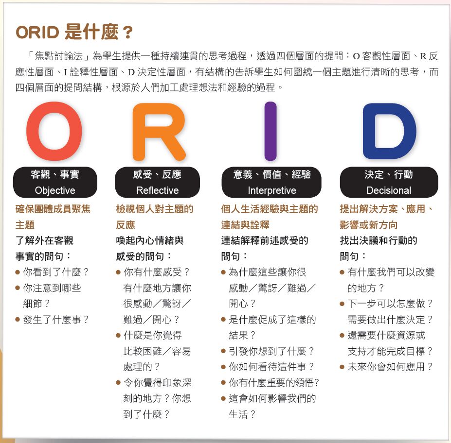 3. 焦點討論法(ORID)可運用在教學中,協助學生理解各種文本的意義。請問其中