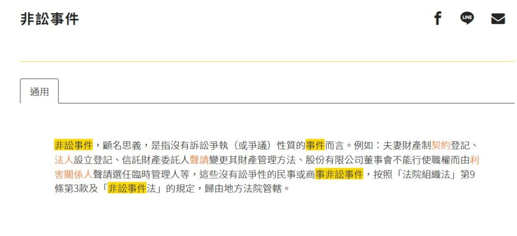 (二) 狹義的非訟事件:是指法院處理無爭訟性質之事件,其適用之法律,包括非訟事件法、民事訴訟法、強制執行法、破產法、提存法及公證法等。依據非訟事件法之分類,則分為民事非訟事件及商事非訟事件。依據非訟事件法所規定之非訟事件,可分為「民事非訟事件」及「商事非訟事件」: