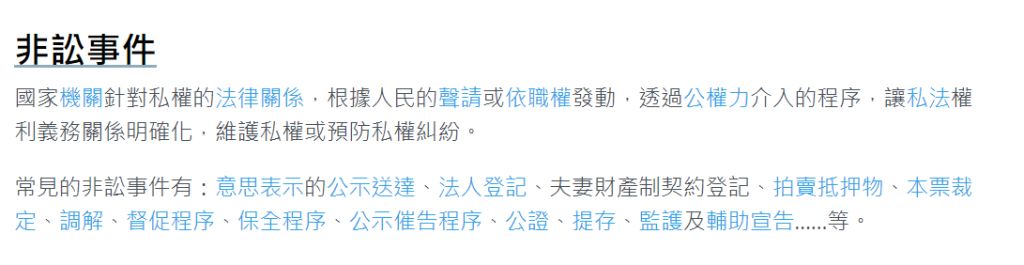 (一) 廣義的非訟事件:舉凡縣市政府之商業登記,及地政事務所之土地登記,包括行政機關處理私權的非訟事件,另外亦包括在其他法律的非訟化程序,例如:民事訴訟法的督促程序、宣告禁治產程序、與強制執行程序等均屬之。