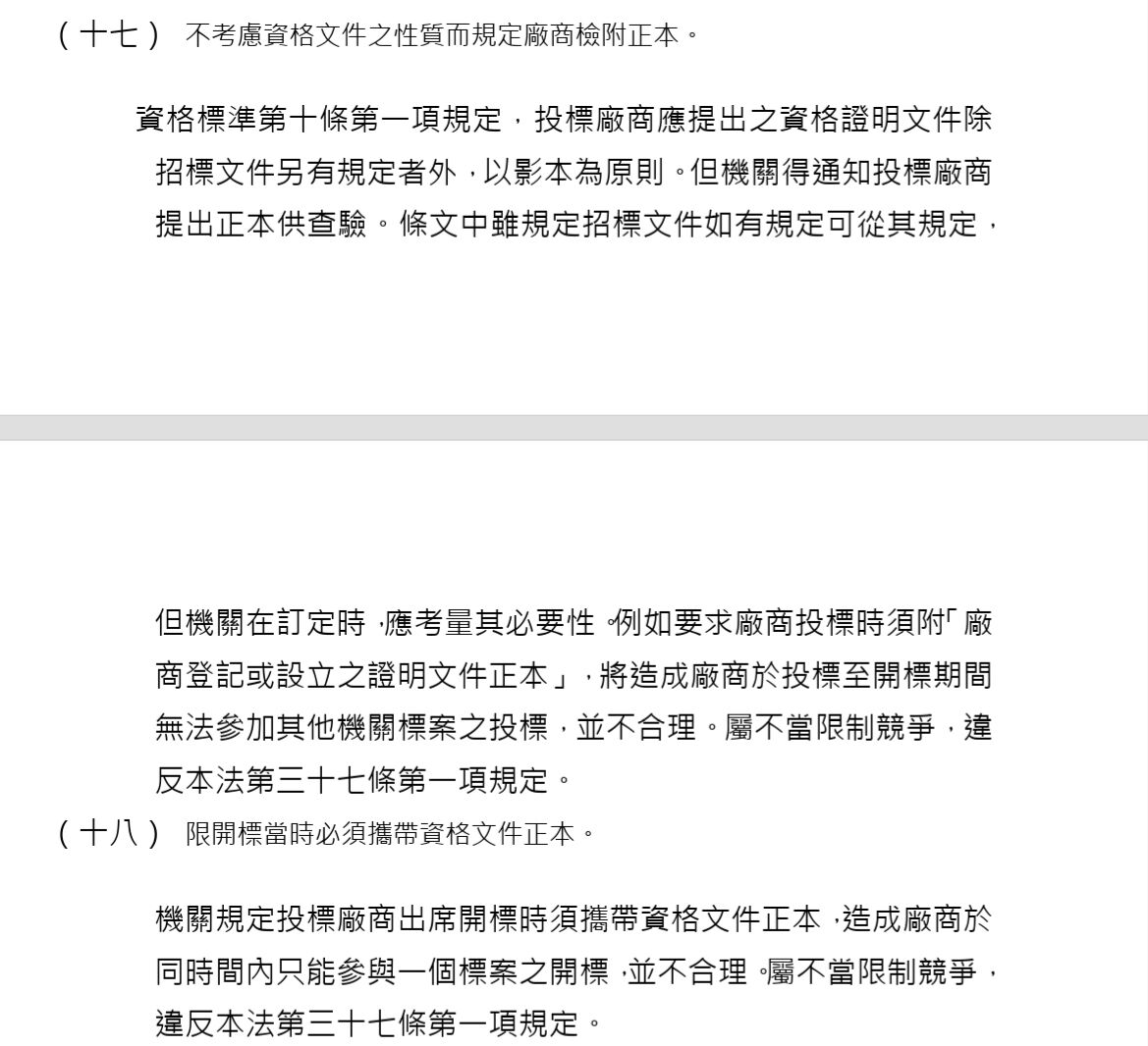 二、為避免招標文件之規定不當限制,影響投標廠商權益,工程會97年2月15日發布令,機關辦理採購,不得於招標文件規定廠商之投標文件有下列情形之一者,為不合格標: