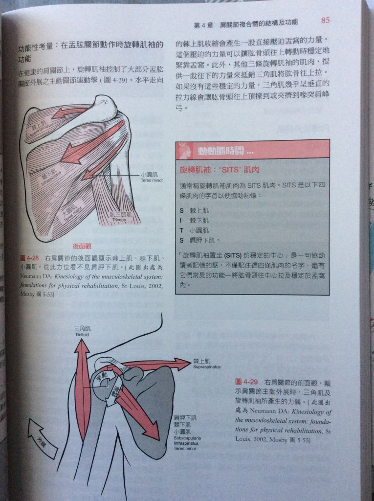 ③棘上肌在外展動作中,將肱骨頭向下壓 ④外展動作中,胸骨鎖骨關節及肩峰鎖骨關節必